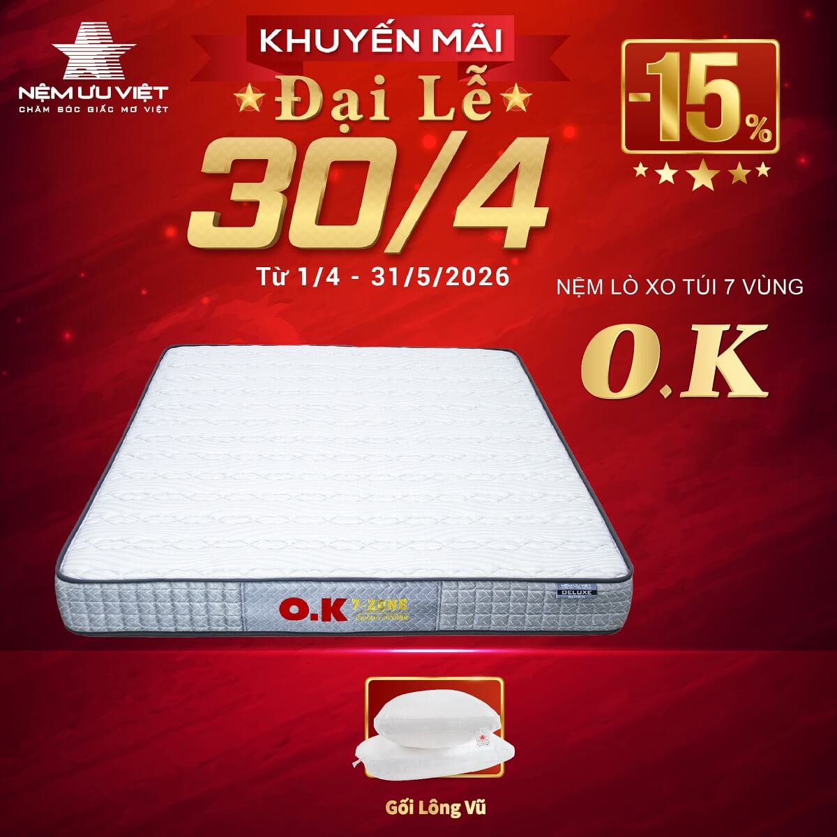 Nệm lò xo túi OK 7 vùng của Nệm Ưu Việt được ra mắt từ năm 1995, sản phẩm đón nhận được sự đánh giá cao và yêu thích của đông đảo khách hàng và trở thành một trong những sản phẩm bán chạy nhất của Nệm Ưu Việt trong nhiều năm qua.