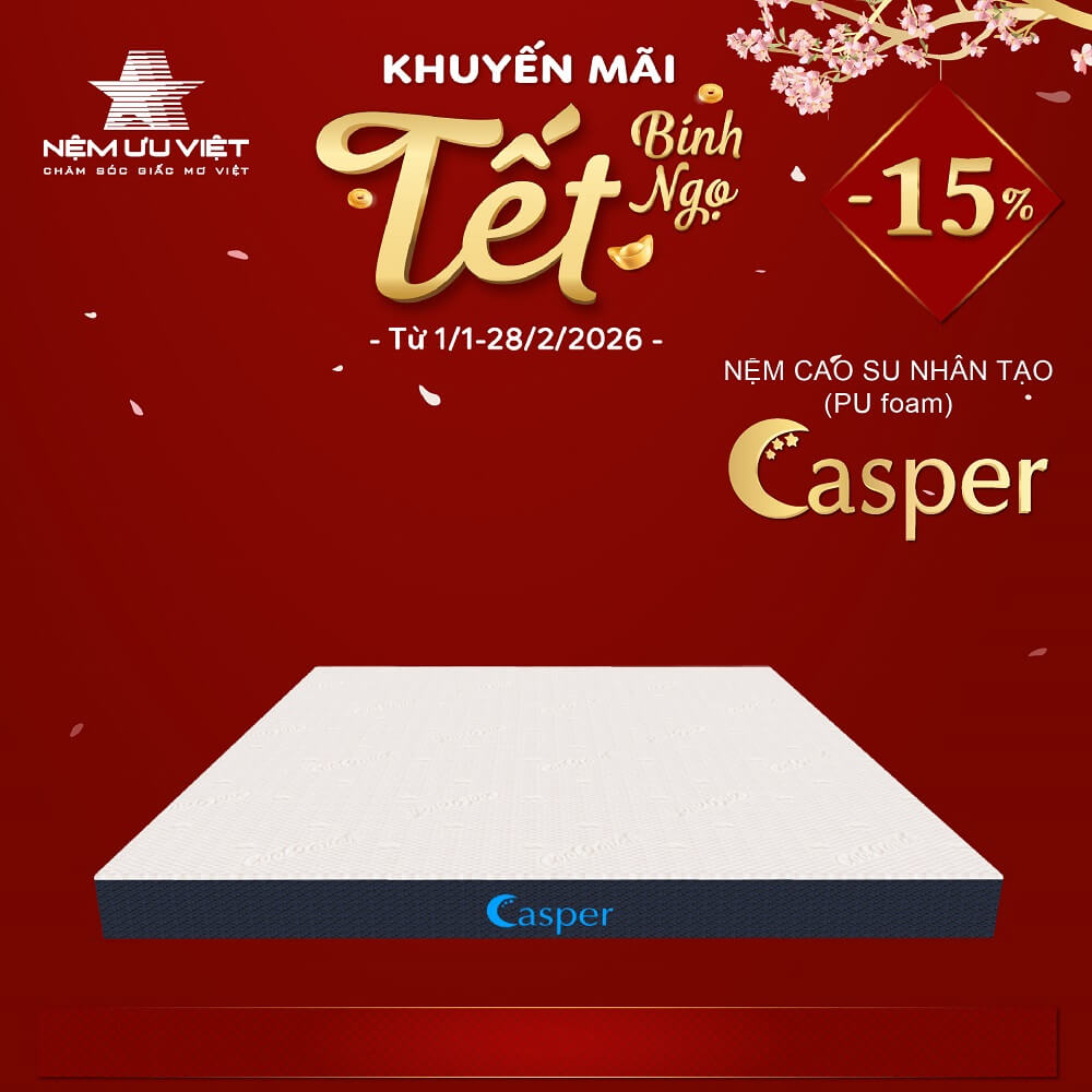 Với phong cách thiết kế sang trọng cùng công nghệ và kỹ thuật sản xuất Nhật Bản hiện đại, nệm cao su nhân tạo (PU foam) Casper của Nệm Ưu Việt sẽ đem lại cảm giác êm ái và dễ chịu cho giấc ngủ ngon.
