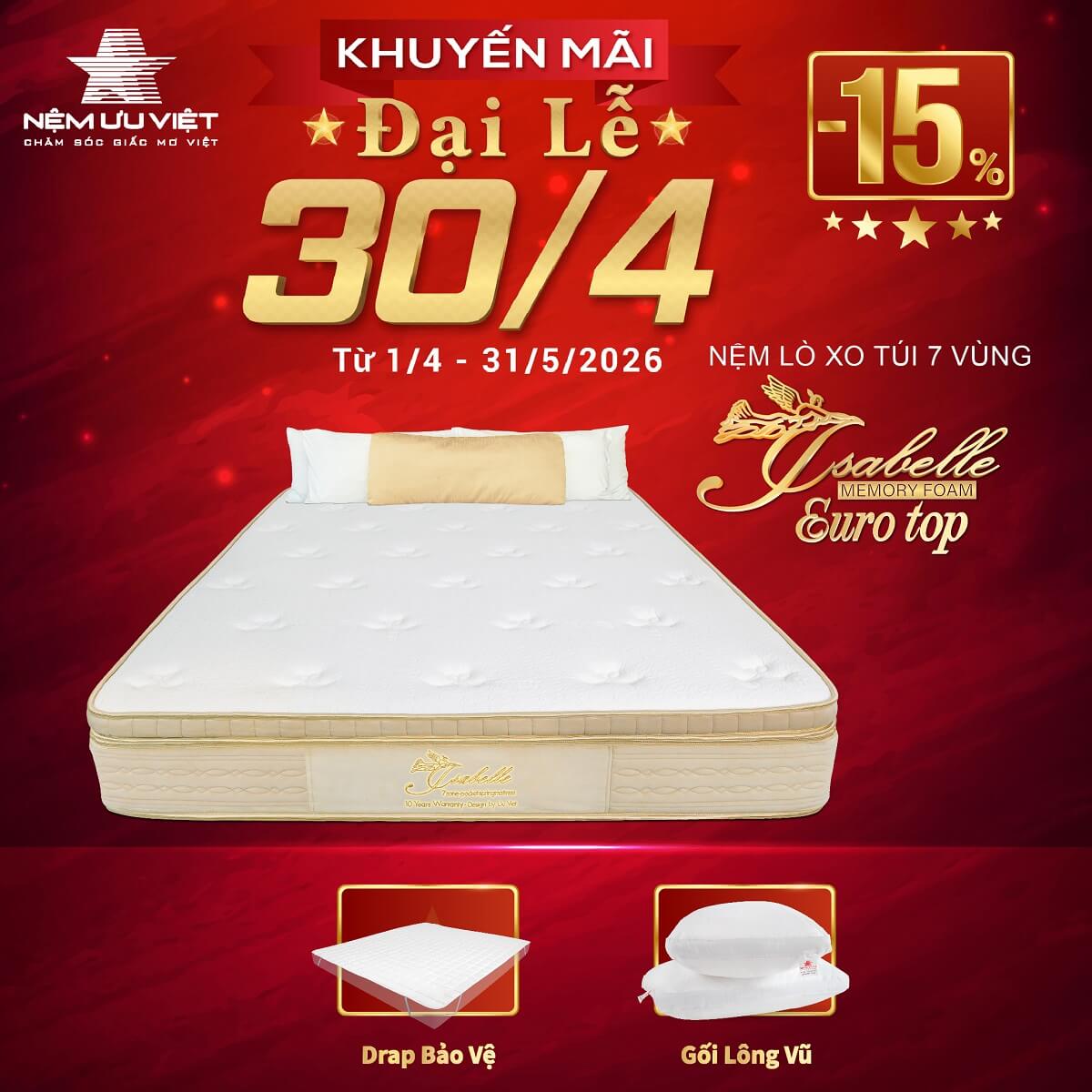 ► Hiện nệm Isabelle Euro Top Memory Foam đang được Nệm Ưu Việt khuyến mãi 15% cùng quà tặng kèm giá trị: 02 cái gối lông vũ công nghiệp 47x67cm + 01 drap bảo vệ nệm cùng quy cách nệm.