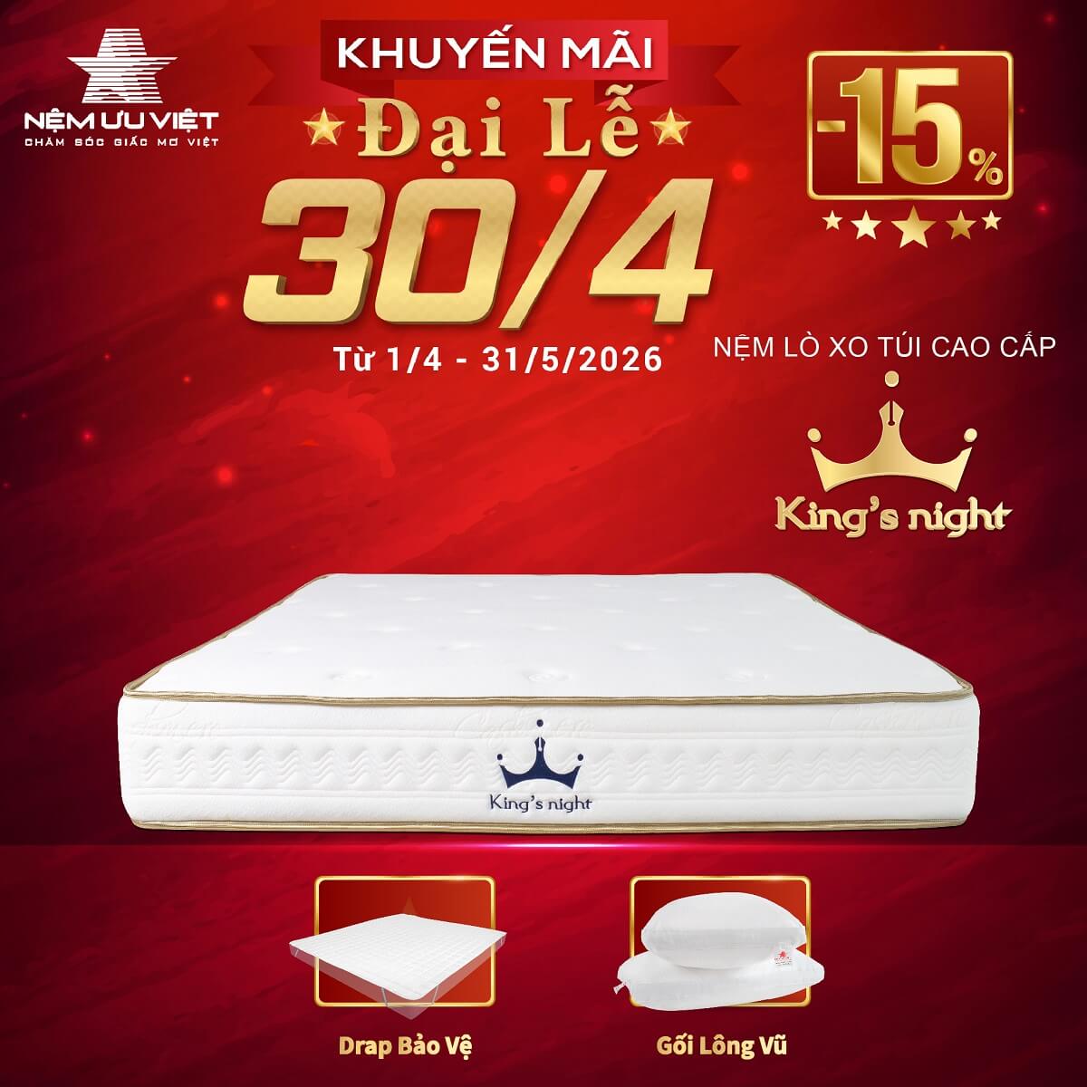 Với nệm lò xo túi King’s night, giấc ngủ của bạn sẽ tuyệt vời hơn mỗi ngày. Mọi thông tin về sản phẩm cần được tư vấn chi tiết hơn, Quý khách vui lòng gọi đến hotline 0965288188 của Nệm Ưu Việt hoặc để lại thông tin trực tuyến để chúng tôi liên hệ đến Quý khách! Hoặc Quý khách có thể đến showroom gần nhất của Nệm Ưu Việt để trực tiếp cảm nhận và trải nghiệm sản phẩm.