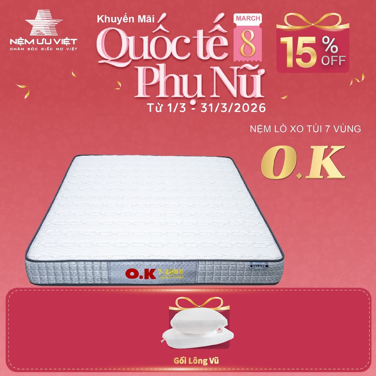 Nệm lò xo túi OK 7 vùng của Nệm Ưu Việt được ra mắt từ năm 1995, sản phẩm đón nhận được sự đánh giá cao và yêu thích của đông đảo khách hàng và trở thành một trong những sản phẩm bán chạy nhất của Nệm Ưu Việt trong nhiều năm qua.