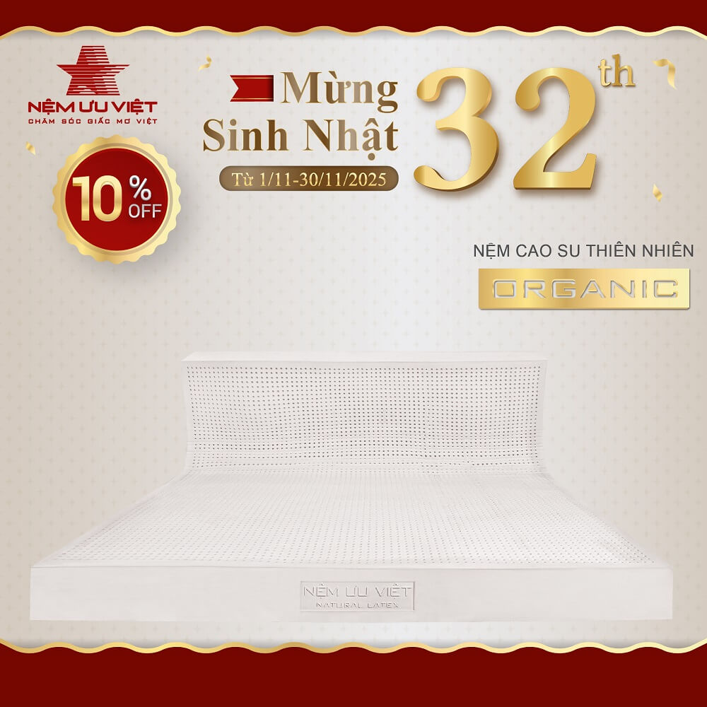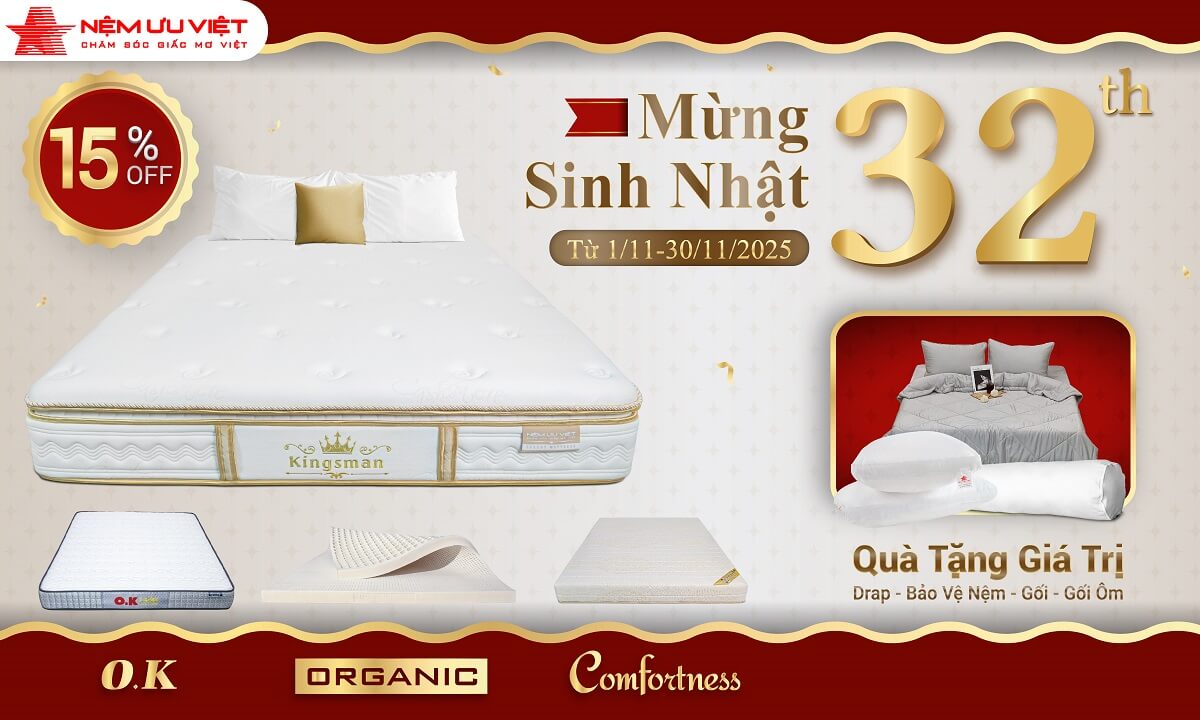 Mừng sinh nhật lần thứ 32, Nệm Ưu Việt gửi đến Quý khách hàng chương trình khuyến mãi hấp dẫn cùng quà tặng giá trị kèm nệm từ ngày 01 đến ngày 30/11/2025.