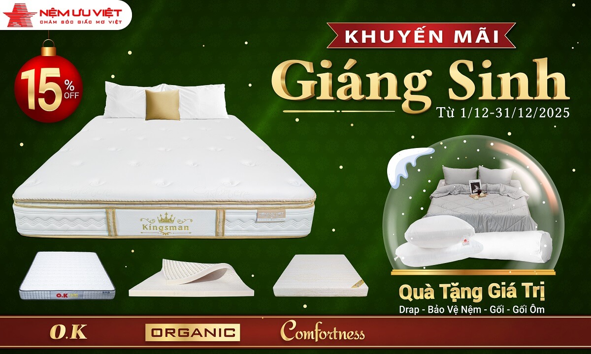 Chương trình sẽ kết thúc khi hết hàng. Mời Quý khách đến showroom Nệm Ưu Việt gần nhất xem sản phẩm, trải nghiệm sản phẩm và chọn mua những mẫu nệm và sản phẩm phòng ngủ khác chất lượng của Nệm Ưu Việt với chương trình khuyến mãi hấp dẫn đón Giáng Sinh và Năm Mới 2026!