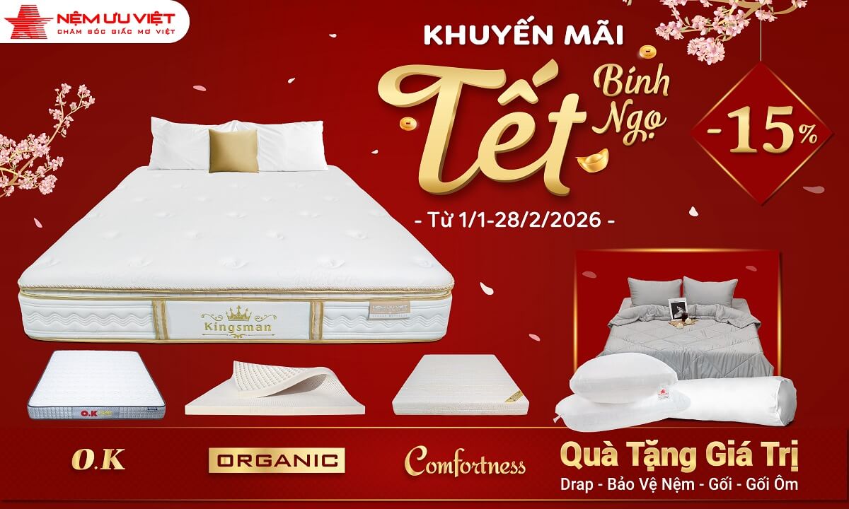 KHUYẾN MÃI TẾT BÍNH NGỌ 2026 - Đón Tết Nguyên Đán Bính Ngọ, Nệm Ưu Việt gửi đến Quý khách hàng chương trình khuyến mãi hấp dẫn cùng quà tặng giá trị kèm nệm từ ngày 01/01 đến ngày 28/02/2026.