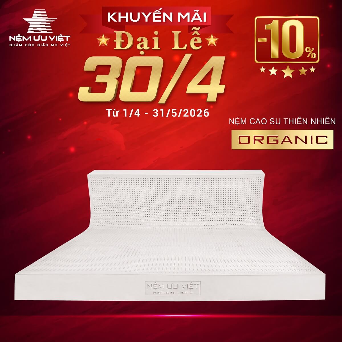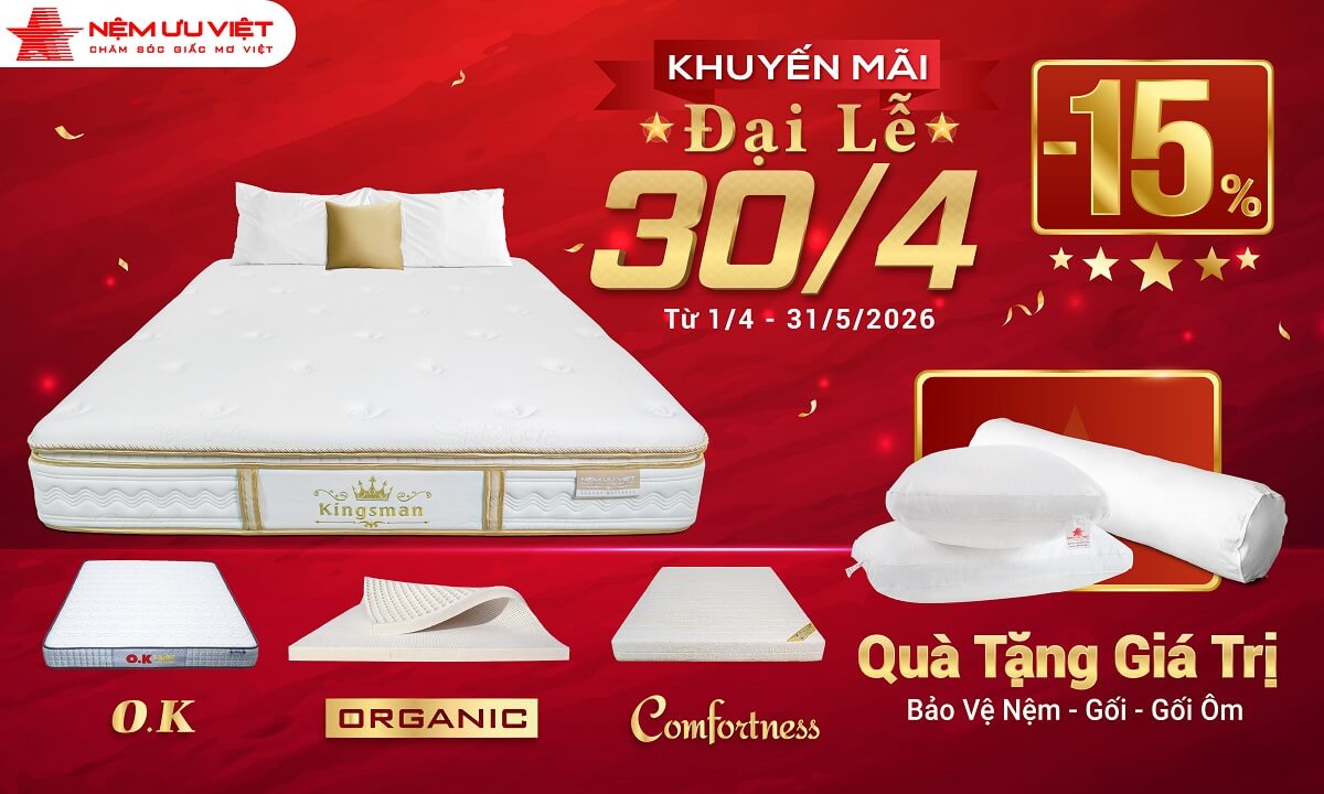 Chào đón Đại Lễ 20/4, Nệm Ưu Việt khuyến mãi lớn - Giảm giá nhiều mẫu nệm và các sản phẩm nội thất phòng ngủ khác cùng quà tặng giá trị kèm nệm từ ngày 01/034 đến ngày 31/05/2026.
