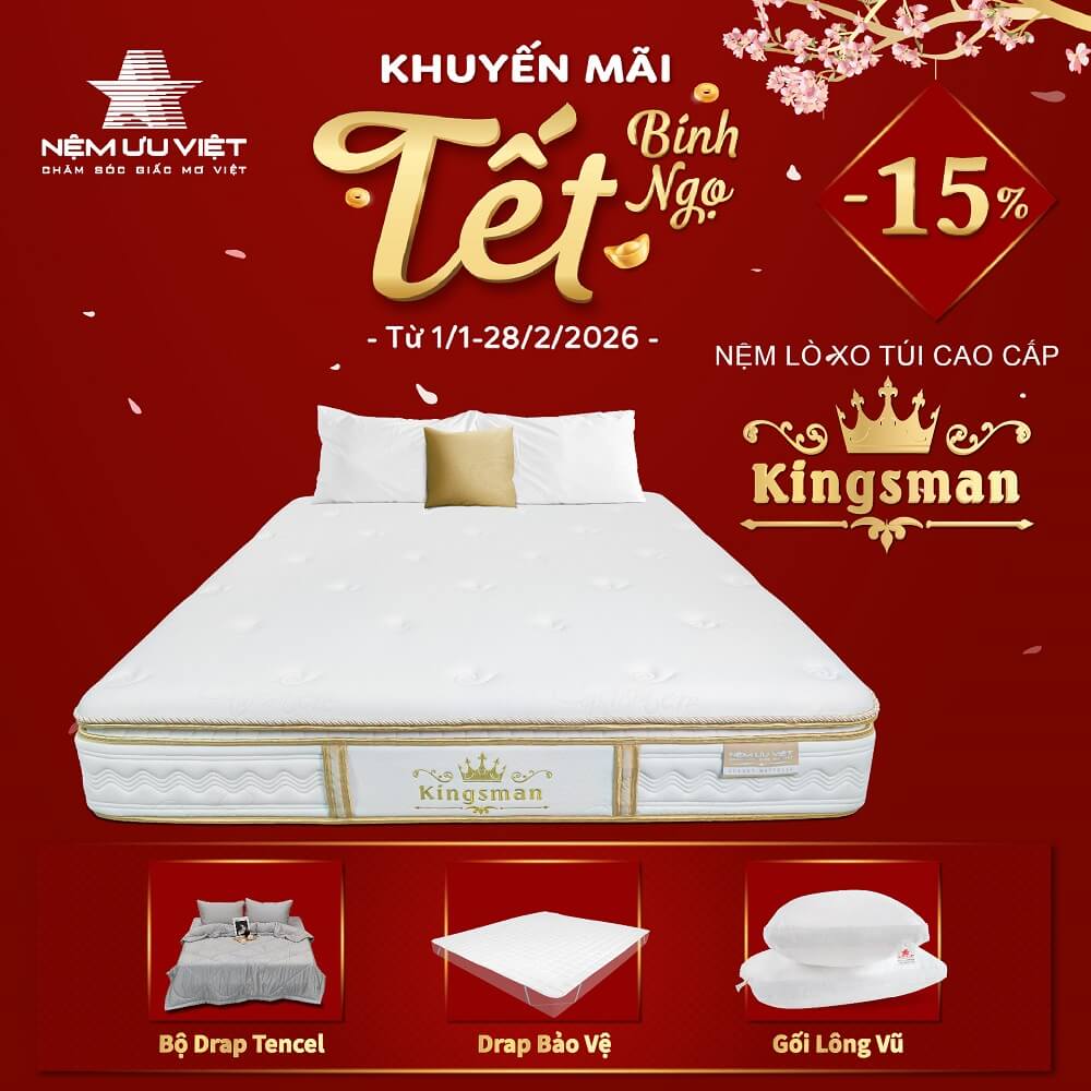 Nệm lò xo túi Kingsman là mẫu nệm lò xo cao su cao cấp được Nệm Ưu Việt ra mắt trong năm 2019. Sản phẩm nhận được sự đánh giá cao và yêu thích của đông đảo khách hàng ngay từ khi được trưng bày tại shoroom với thiết kế sang trọng, đẳng cấp châu Âu cùng những tính năng siêu việt. Kingsman - Nệm của sự đẳng cấp, chắc chắn sẽ mang lại cho bạn giấc ngủ thượng hạng hằng đêm.